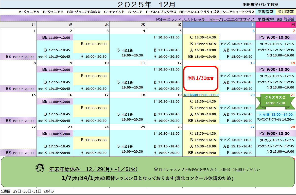 Scheduleスケジュールお知らせ・梁川教室シニアショートクラスは11月より名称が BE(バレエエクササイズ)クラスとなります・キッズクラス10月より13:30開始となります休 講 ・ 振 替・1月10日(土)梁川はクラスレッスンを行います・12月13日(土)梁川と1月10日(土)平野は1月31日(土)へ振替いたします・1月7日(水)は4月1日(水)の振替レッスン日です
